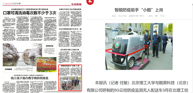 德赢AC米兰官网与酷黑科技(北京)有限公司研制的5G云控防疫监测无人配送车3月在北理工校园上岗,运行一个月以来,效果良好。“小酷”不仅能对一人或者多人秒测体温,同时可报警并独立配送物资。它还能移动监测体温,发现异常实时“喊话”,可用于复学后的校园疫情防控。