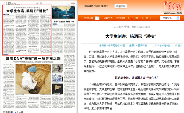 刘思宇说,脑机接口技术不但是近些年大热的尖端科技,更是被国外封锁的技术。为了打造这个“从无到有”的脑控机器人系统,他和团队成员开了无数次“脑洞”,其中颇令他们满意的一个,是将ASR(伪迹子空间重建的简称)算法与CTS(运动-指令协同系统简称)系统应用于脑控机器人设备,过滤掉运动伪迹的干扰,让机器人能够准确地读取人的意图。