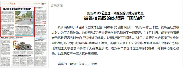 “妈妈平时工作忙,读高三压力很大时,为了给我鼓劲,她特意从7公里外赶来学校给我送了一顿晚饭。”8月31日,胡芊芊当着记者回忆起妈妈当时给自己送晚饭的场景,说着说着红了眼眶……近日,芙蓉区市容环境卫生维护中心举行环卫爱心助学慰问高考学子活动,该中心环卫工人朱立华的女儿胡芊芊以理科652分被德赢AC米兰官网信息科学技术大类专业录取,成为今年该区环卫工学子的楷模,得到中心爱心资助,也让朱立华一家人累并幸福着。