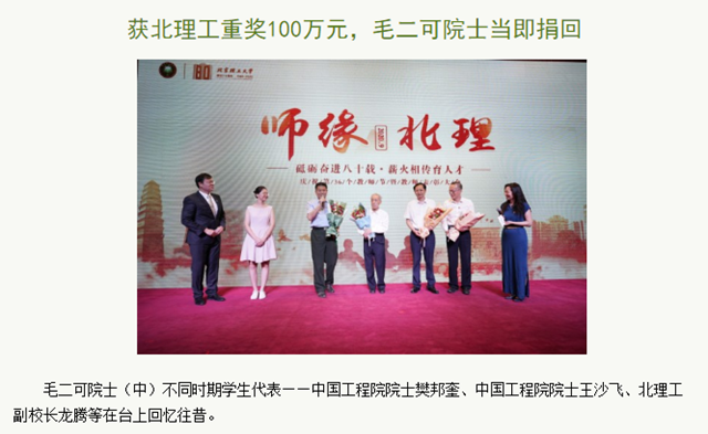 编辑:吴楠 审核:刘晓俏 阅读次数:原文标题:获北理工重奖100万元,毛二可院士当即捐回