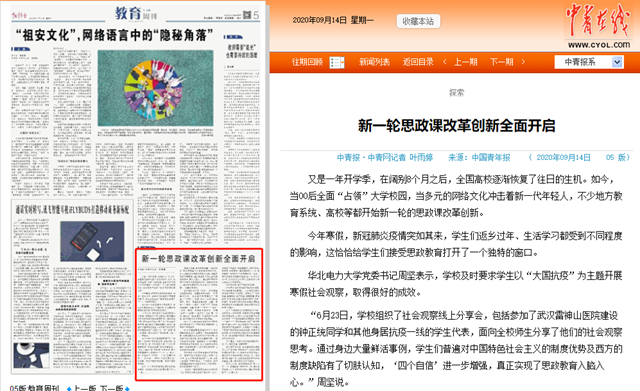 “6月23日,学校组织了社会观察线上分享会,包括参加了武汉雷神山医院建设的钟正统同学和其他身居抗疫一线的学生代表,面向全校师生分享了他们的社会观察思考。通过身边大量鲜活事例,学生们普遍对中国特色社会主义的制度优势及西方的制度缺陷有了切肤认知,‘四个自信’进一步增强,真正实现了思政教育入脑入心。”周坚说。