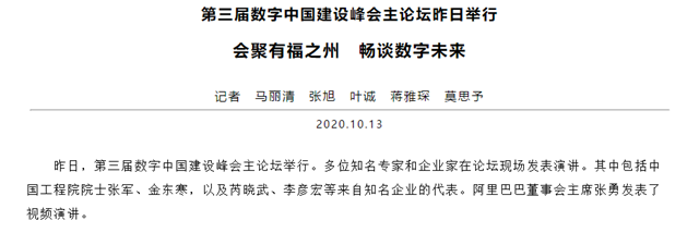昨日,第三届数字中国建设峰会主论坛举行。多位知名专家和企业家在论坛现场发表演讲。其中包括中国工程院院士张军、金东寒,以及芮晓武、李彦宏等来自知名企业的代表。阿里巴巴董事会主席张勇发表了视频演讲。