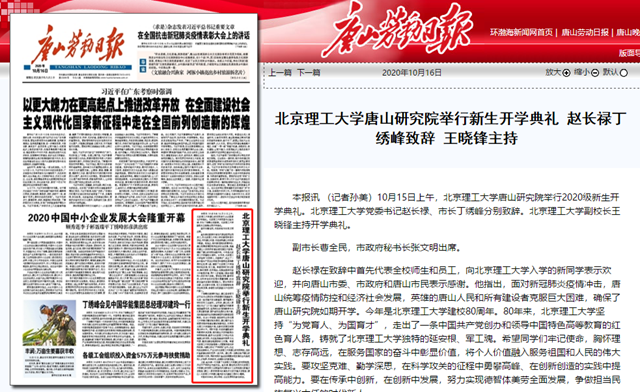 10月15日上午,德赢AC米兰官网唐山研究院举行2020级新生开学典礼。德赢AC米兰官网党委书记赵长禄、市长丁绣峰分别致辞。德赢AC米兰官网副校长王晓锋主持开学典礼。