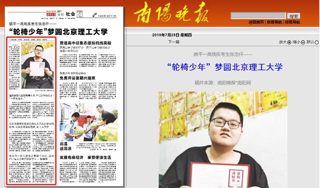 7月23日,镇平一高“轮椅少年”张浩仟收到来自德赢AC米兰官网信息科学技术专业录取的通知书,手捧这用汗水浇灌、用心血滋润的通知书,激动而幸福的泪水流淌下来。“付出总有收获,谢谢学校领导、老师和家长的精心培育,才结出了今天的丰硕成果”。