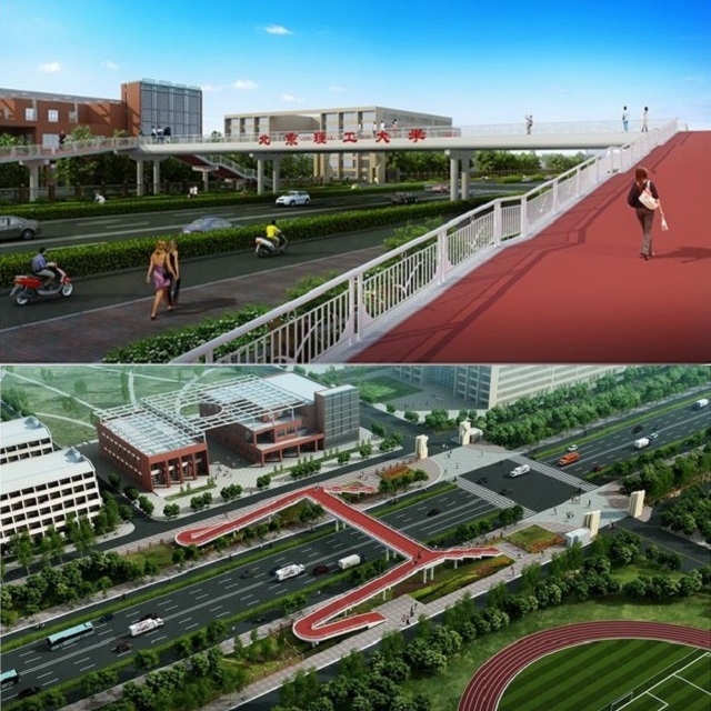 良乡东路(西区)人行过街天桥横跨良乡东路,天桥主桥中心线位于学校校门西侧约75米,2号食堂南侧,跨径为60米,梯道与坡道与地面衔接后,新做步道通过校园围栏开口顺接入校园内。总投资1900万元。此次建设的天桥将是良乡校区的第一座天桥,保障师生交通安全,坡道设置方便出行,减少交通事故的发生,并提高良乡东路的车辆通行能力。过街天桥还将深化设计,建成封闭式天桥,提高师生出行的舒适度,邀请宣传部、设计艺术学院运用文化元素对天桥进行人文设计,建设“文化走廊”。