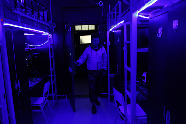 “我们的整体设计是一个太空舱。”邓亚东说,他打开27日晚上拍的照片,宿舍四个同学都坐在自己的座位上,房顶中央的白炽灯被关上,从床边和房顶四周延伸过去的LED灯带闪着蓝色的光,从门口看去,确实像是进了一个微型舱内。