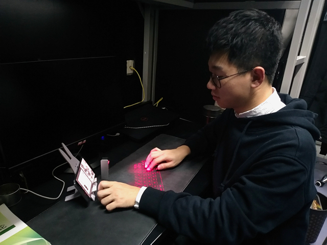 宿舍的宋善台正在座位上修改论文,由于论文需要在15:30之前交,宋善台特意从外边赶回来,做最后的修改。记者走近一看,他没有开电脑,而是用手指在桌子上敲打文字。原来,他使用了“投影键盘”,打开这个工具,桌子上就会投出一个像键盘一样的影子,在桌子的键盘上打字,通过蓝牙,打好的字就可以显示在手机屏幕上,文章修改完直接通过手机发到老师邮箱。“着急的时候就不用再等待电脑开机了。”宋善台说,如果早晨交论文的话,还可以把键盘“投”在床桌上,这样“不出被窝也能提交,基本上桌子就可以代替电脑。”