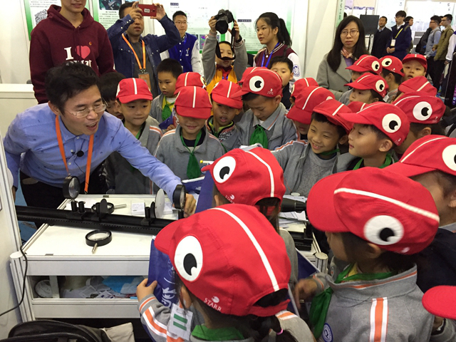 苏铁健老师在全国“挑战杯”现场给参观的小学生讲解TEMS