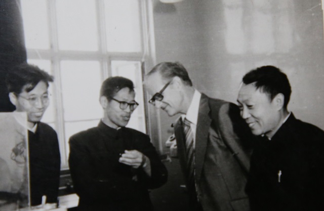 70年代,张忠廉向外国专家介绍光电阴极制作检控仪
