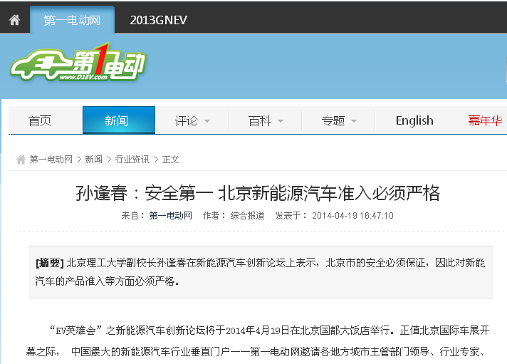 【第一电动网】北理工孙逢春谈北京新能源汽车准入