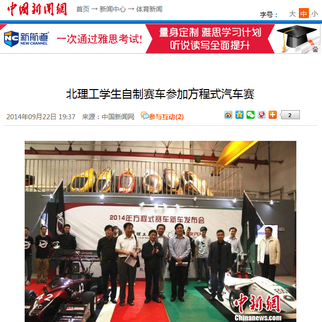 2. 中国新闻网 《北理工学生自制赛车参加方程式汽车赛》 2014年9月22日