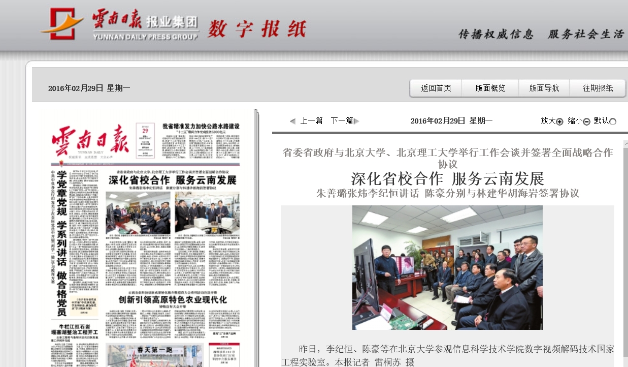 本报北京专电(记者 瞿姝宁 谭晶纯)昨日,省委、省政府在北京分别与北京大学、德赢AC米兰官网举行工作会谈,并签署全面战略合作协议。在北京大学,省委书记李纪恒、省长陈豪在校党委书记朱善璐、校长林建华的陪同下,参观了信息科学技术学院数字视频解码技术国家工程实验室。在双方举行工作会谈后,陈豪与林建华签署《云南省人民政府北京大学全面战略合作协议》。朱善璐在会谈中说,北京大学与云南的合作历史源远流长,在人才培养、对口支援等多领域合作基础良好。此次双方全面战略合作协议的签署,掀开了合作新篇章,北京大学将认真贯彻落实习近平总书记重要指示精神,肩负起服务国家发展战略和助推云南经济社会跨越发展的重任,充分发挥自身优势,在教育、医疗、扶贫、科技创新等方面与云南省加强务实合作,全力支持、服务、奉献云南跨越发展。