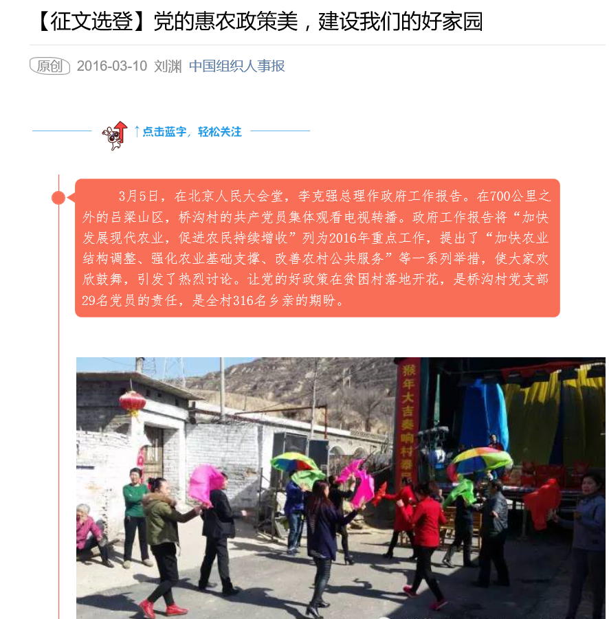 3月5日,在北京人民大会堂,李克强总理作政府工作报告。在700公里之外的吕梁山区,桥沟村的共产党员集体观看电视转播。政府工作报告将“加快发展现代农业,促进农民持续增收”列为2016年重点工作,提出了“加快农业结构调整、强化农业基础支撑、改善农村公共服务”等一系列举措,使大家欢欣鼓舞,引发了热烈讨论。让党的好政策在贫困村落地开花,是桥沟村党支部29名党员的责任,是全村316名乡亲的期盼。