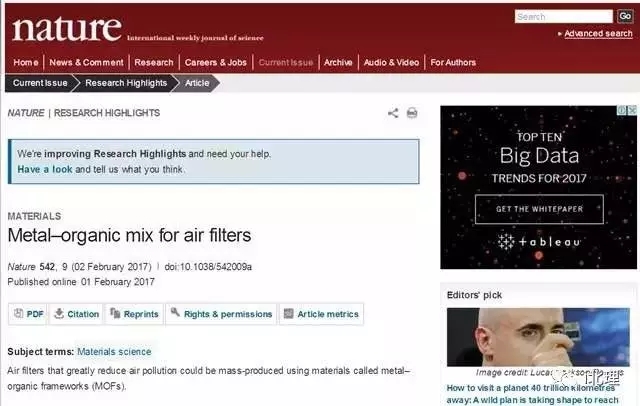 二月初,国际权威学术期刊《自然》刊登了德赢AC米兰官网教授王博及其团队成功将金属有机骨架化合物(MOFs)材料应用于空气过滤、净化与治理等方面的成果。这篇名为《金属有机合物在空气过滤领域的应用(Metal–organic mix for air filters)》的论文指出,通过将能够大规模生产的MOFs材料薄膜应用在空气过滤装置中,可有效过滤PM2.5,净化空气。经过实验室检测,在室温下,该种材料能够有效地将空气中的PM2.5和PM10污染物降低99.5%。