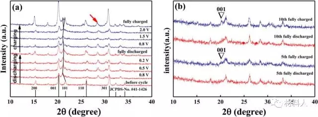 V2O5-Al电池首周充放电时,101峰的位置发生不可逆的左移,说明在首周放电过程中V2O5发生了不可逆的结构变化。在随后的充放电循环中,001峰随着充放电发生了可逆的有规律的强度变化。正极材料的结构变化也印证了首周放电反应的不可逆性和第二周之后的电化学反应可逆性的差异。