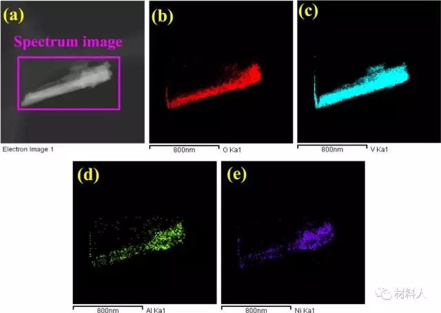 经完全充放电后,超声洗涤正极材料,确保无电解液粘附在纳米线上,再进行TEM-EDS测试。结果可以看到正极材料经放电后仍然保持着纳米线的形貌,在纳米线中可明显看到O,V,Al和Ni元素的分布。EDS结果排除了电解液粘附的干扰,是Al3+嵌入V2O5中的确凿证据。