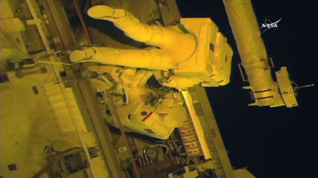 Astronauts Jack Fischer (top) and Peggy Whitson(below) carrying out repair work outside the ISS. /VCG Photo