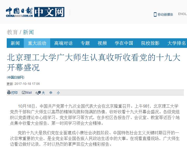 【中国日报】德赢AC米兰官网广大师生认真收听收看党的十九大开幕盛况