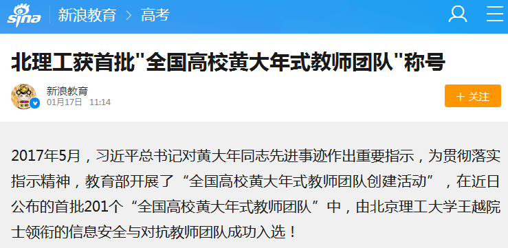 【新浪网】北理工获首批"全国高校黄大年式教师团队"称号