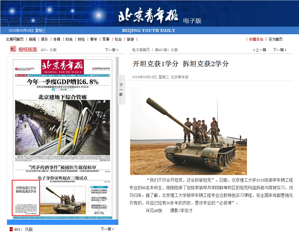 【北京青年报·头版】北理工:开坦克获1学分 拆坦克获2学分