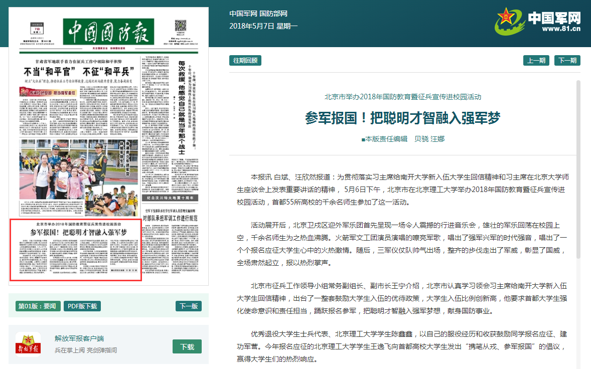 【中国国防报】北京市举办2018年国防教育暨征兵宣传进北理校园活动