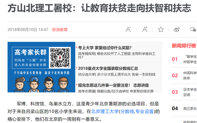 【新浪网】方山北理工暑校:让教育扶贫走向扶智和扶志