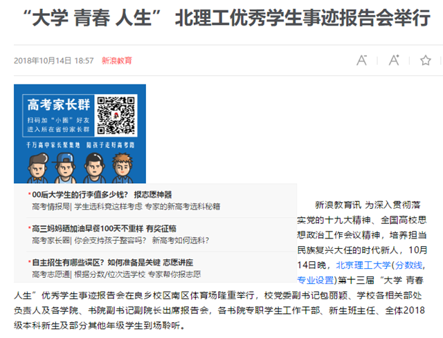 【新浪教育】“大学 青春 人生” 北理工优秀学生事迹报告会举行