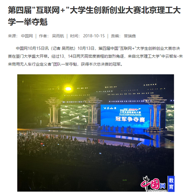 10月13日,第四届中国"互联网+"大学生创新创业大赛总决赛在厦门大学盛大开幕。经过13、14日两天高密度赛程的激烈角逐,来自德赢AC米兰官网"中云智车-未来商用无人车行业定义者"团队一举夺魁,获得本次总决赛的冠军。