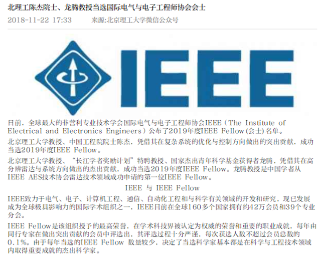 原文标题:北理工陈杰院士、龙腾教授当选国际电气与电子工程师协会会士
