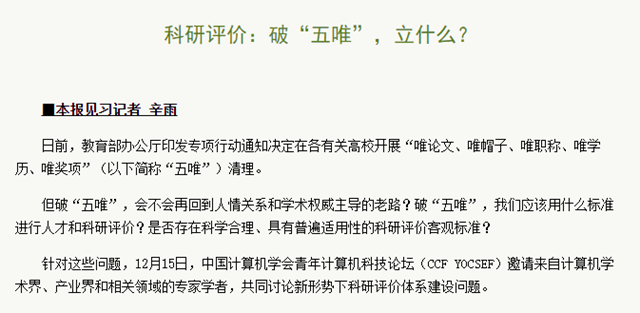 针对这些问题,12月15日,中国计算机学会青年计算机科技论坛(CCF YOCSEF)邀请来自计算机学术界、产业界和相关领域的专家学者,共同讨论新形势下科研评价体系建设问题。
