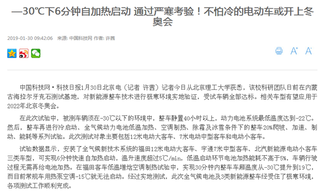 【中国科技网】—30℃下6分钟自加热启动通过严寒考验!不怕冷的电动车或开上冬奥会