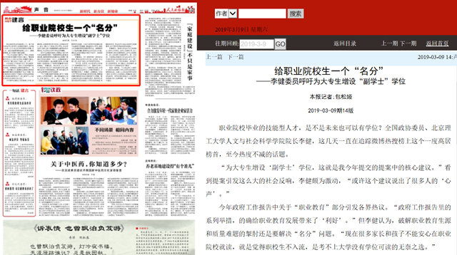 “为大专生增设‘副学士’学位,这就是我今年提交的提案中的核心建议。”看到提案引发这么大的社会反响,李健颇为激动,“或许这个建议说出了很多人的‘心声’。”