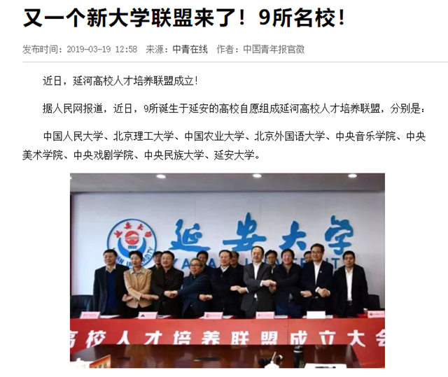 据人民网报道,近日,9所诞生于延安的高校自愿组成延河高校人才培养联盟,分别是:
