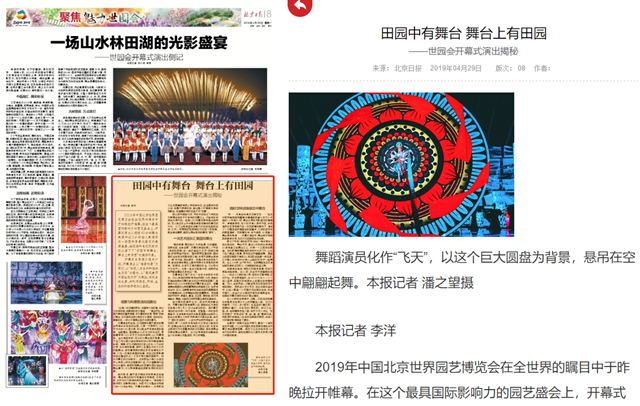 2019年中国北京世界园艺博览会在全世界的瞩目中于昨晚拉开帷幕。在这个最具国际影响力的园艺盛会上,开幕式演出以短短40分钟舞台表演和近3分钟焰火表演形成一场园林情景光影艺术表演盛宴,给现场和电视机前的观众留下了“田园中有舞台,舞台上有田园”的美好印象。