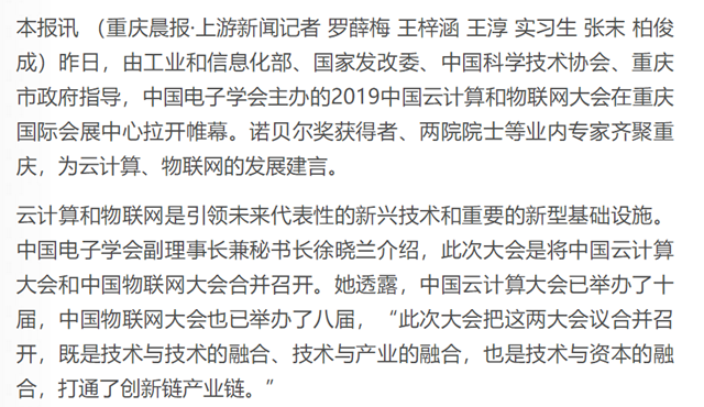 云计算和物联网是引领未来代表性的新兴技术和重要的新型基础设施。中国电子学会副理事长兼秘书长徐晓兰介绍,此次大会是将中国云计算大会和中国物联网大会合并召开。她透露,中国云计算大会已举办了十届,中国物联网大会也已举办了八届,“此次大会把这两大会议合并召开,既是技术与技术的融合、技术与产业的融合,也是技术与资本的融合,打通了创新链产业链。”