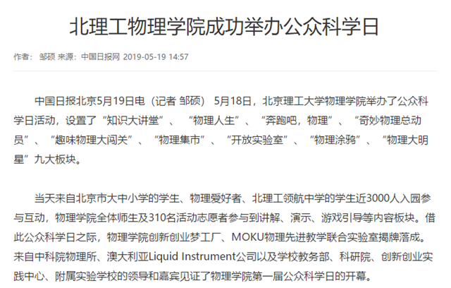 当天来自北京市大中小学的学生、物理爱好者、北理工领航中学的学生近3000人入园参与互动,物理学院全体师生及310名活动志愿者参与到讲解、演示、游戏引导等内容板块。借此公众科学日之际,物理学院创新创业梦工厂、MOKU物理先进教学联合实验室揭牌落成。来自中科院物理所、澳大利亚Liquid Instrument公司以及学校教务部、科研院、创新创业实践中心、附属实验学校的领导和嘉宾见证了物理学院第一届公众科学日的开幕。