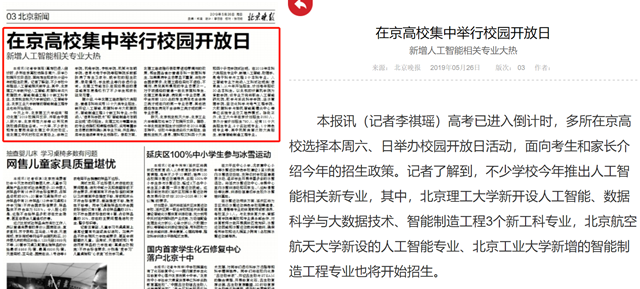 昨天,北京航空航天大学、北京工业大学等高校也举办了校园开放日。据悉,今年北航在京招生计划预计与2018年基本持平。该校今年继续实行大类招生,涵盖航空航天、信息、理科和文科四个大类和四个示范学院试验班。在2019年本科大类招生专业中,新增人工智能、物理学、微电子科学与工程3个本科专业。人工智能专业方向纳入工科试验班类(信息类),从今年开始招生,计划每年招收30名本科生。以北航的计算机学院为承载学院,该专业方向将联合人工智能研究院、数学与系统科学学院、经济管理学院、自动化科学与电气工程学院、大数据科学与脑机智能高精尖中心等单位实施专业交叉培养模式。除此之外,北工大今年在京计划招生3150人,京外分省计划招生780人,设有11个大类招生专业,8个实验班专业,1个特色班专业等,其中机械类首次按大类招生,新增智能制造工程专业。