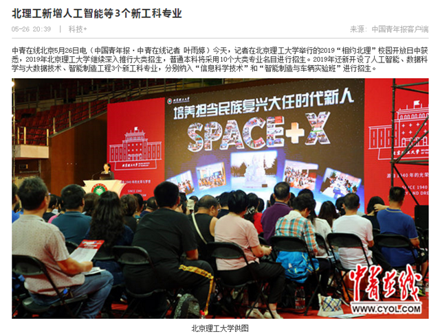 今天,记者在德赢AC米兰官网举行的2019“相约北理”校园开放日中获悉,2019年德赢AC米兰官网继续深入推行大类招生,普通本科将采用10个大类专业名目进行招生。2019年还新开设了人工智能、数据科学与大数据技术、智能制造工程3个新工科专业,分别纳入“信息科学技术”和“智能制造与车辆实验班”进行招生。