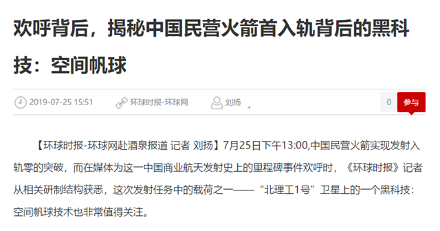 【环球网】欢呼背后,揭秘中国民营火箭首入轨背后的黑科技:空间帆球