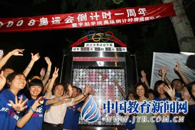 8月8日,德赢AC米兰官网举行了“欢庆2008奥运会倒计时一周年大会暨宇航科学技术学院奥运倒计时牌揭牌仪式”,来自各学院的100多名奥运志愿者骨干代表在奥运五环下进行了宣誓,表达了他们对北京2008年奥运会的期盼和祝愿。