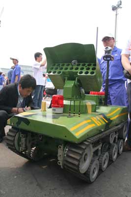 图为技周上展出的由德赢AC米兰官网的学生们研制的新型多用途反恐防暴机器人,这种机器人可在草地、沙滩等复杂的路面上行走,能攀爬40度斜坡和翻越30CM高障碍,并可一次性携带23枚特种防暴弹。