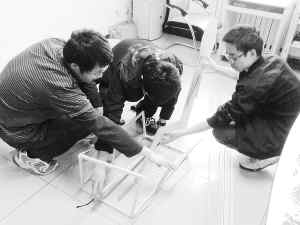 图:几位同学比划的木框和“人形模型”,是他们制造赛车之路的第一步。