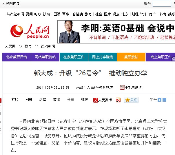 【人民网】北理工党委书记郭大成:升级“26号令” 推动独立办学