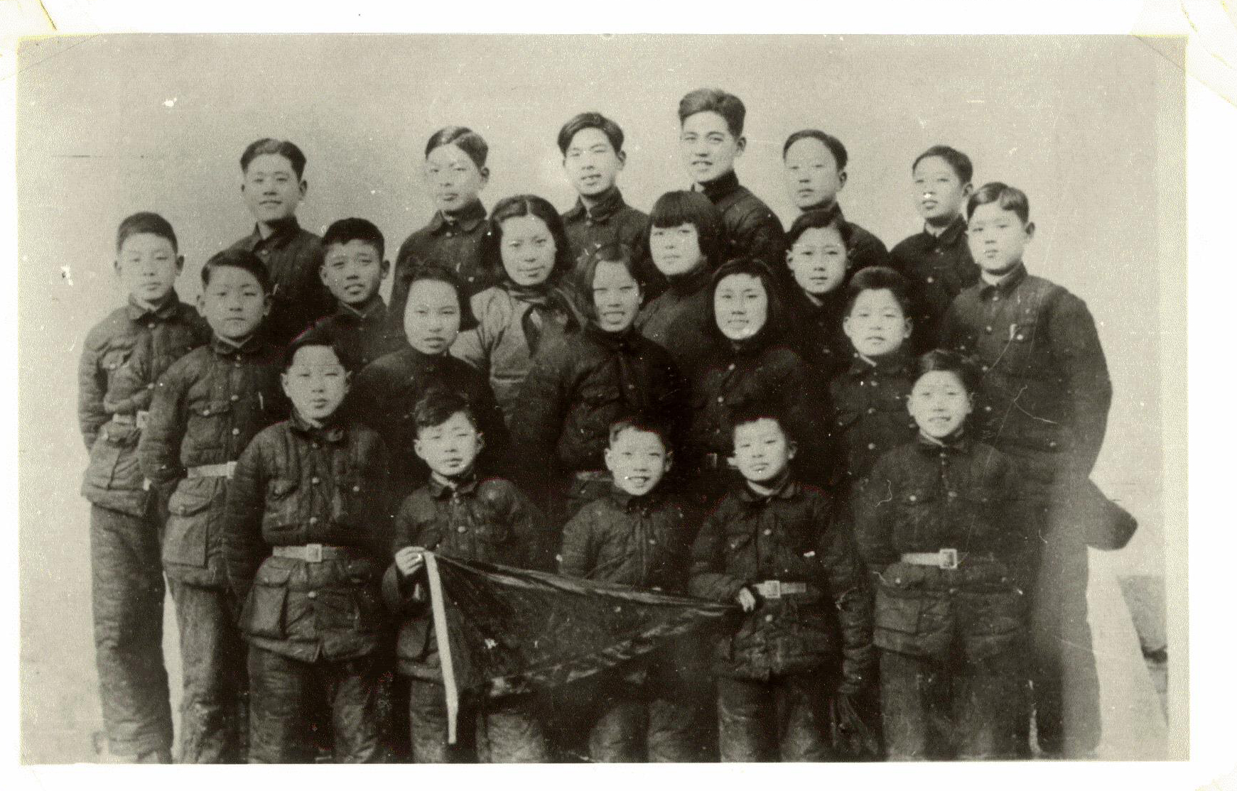 (图1939年冬 开封孩子剧团在河南开展抗日救亡宣传活动,第三排左一为赵东宛校友)