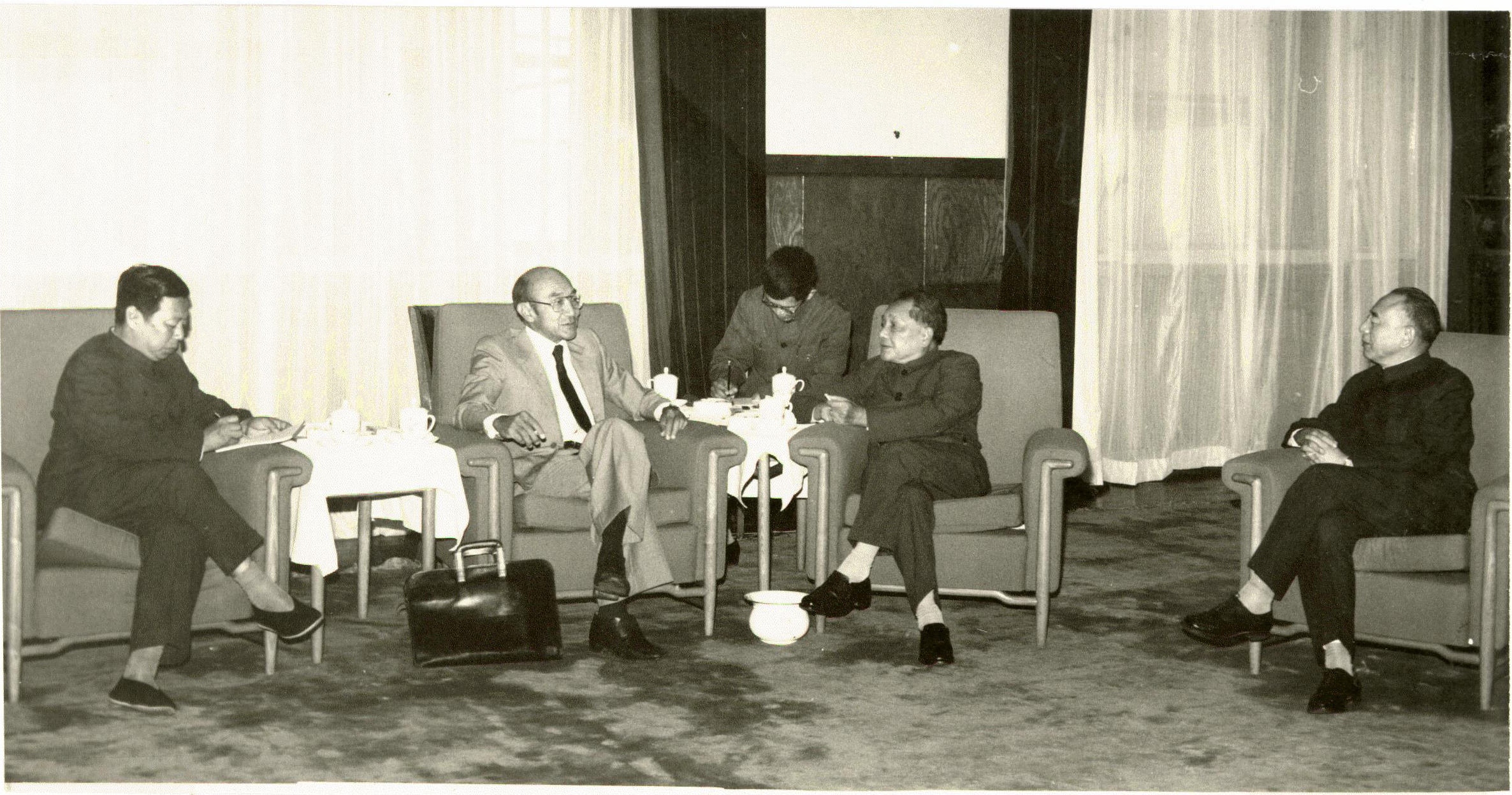 1981年,赵东宛校友(右一)陪同邓小平同志接见外宾,时任国家科委副主任兼国家计委副主任
