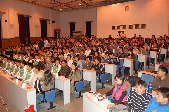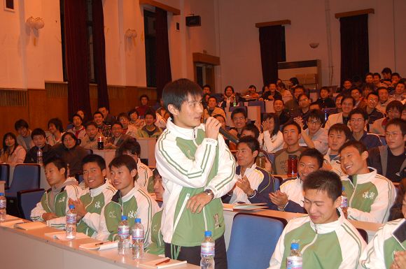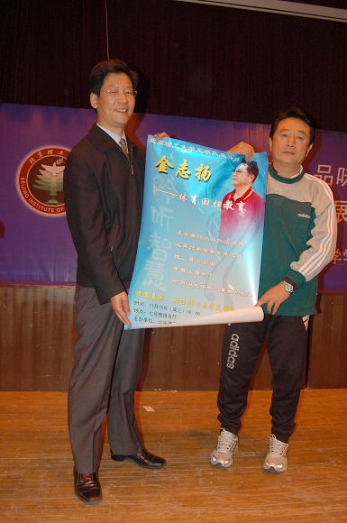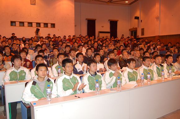 由学生工作处主办的本学年第十期聆听智慧名家系列讲座于2006年11月15晚19:00在7号楼报告厅举行,我校足球队总教练金志扬教授为我校师生奉献了一场精彩的“体育回归教育”专题报告会,讲座由学生工作处处长刘明奇同志主持。