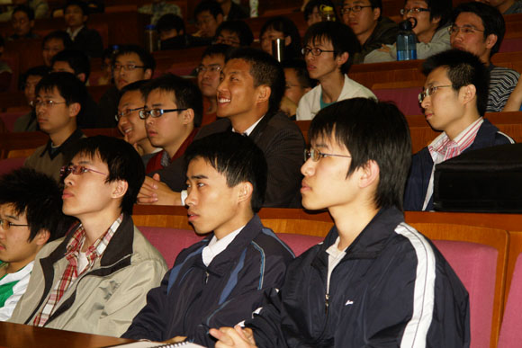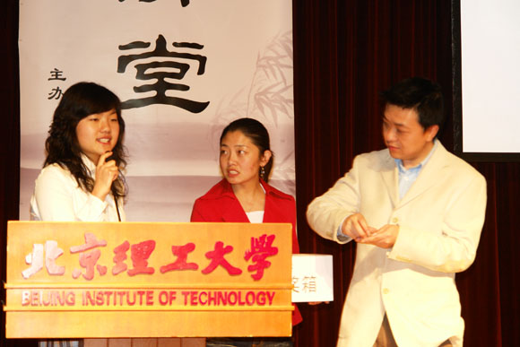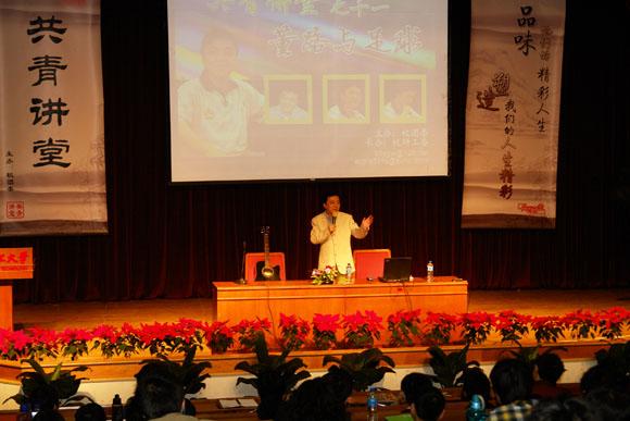 精彩的演讲不时赢得大家热烈的掌声。在提问环节,同学们踊跃提问,阐述自己的观点,董先生都友善而风趣的予以回答。最后,由董路先生抽出了本场讲座的幸运观众,获得由董路先生签名的个人CD和北京爱国者大学生足球队中甲北理首次主场(本月21日)的入场券。