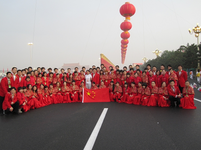 抵达天安门广场后,同学们按照预先制定的集结疏散方案,用“块移动”的方式抵达演出地点,清晨的广场薄雾刚刚散去,30日夜里的小雨将广场洗刷的更加漂亮。随着演出时刻的临近,所有师生的精神状态都变得异常饱满。在经过两次试音后,大家都一扫昨夜早起的疲惫,将自己调整到了最佳表演状态。