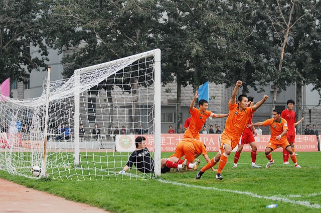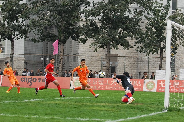 第75分钟,北京理工贵人鸟足球队组织反击,18号杨思源带球到底线,宏登队的犯规让北京理工贵人鸟足球队获得了又一次的前场任意球的机会。8号袁微将球传到弧顶处附近,24号杨阳的头球攻门被于一航挡出,此时北京理工贵人鸟足球队门前有三个队员埋伏在宏登队门前,38号埃米尔机警的将球打入对方球门将比分改写成1:0。之后宏登队开始了疯狂的进攻,但是并没有很好的射门机会。