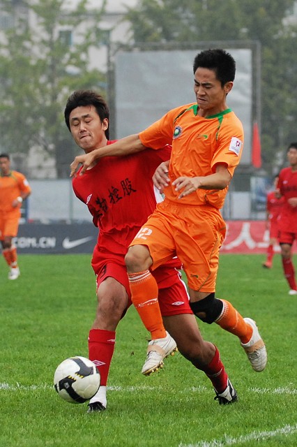 在顶住大学生前15分钟进攻之后,宏登队开始组织反击,双方开始了精彩的对攻大战。先是宏登队在第17分钟由14号刘刚带球突破,几次精彩的晃动并没有突破北京理工贵人鸟足球队的三人防守,丢球后的刘刚在反抢中犯规也领到了本场比赛双方的第一张黄牌。1分钟后,北京理工贵人鸟足球队4号卢斌也在防守对方反击时犯规同样领到黄牌。第25分钟,宏登队14号刘刚在前场得到队友的抢断球后在禁区外起脚远射,球打在球门右侧立柱后弹出底线,宏登队也错失了本场比赛最好的机会。